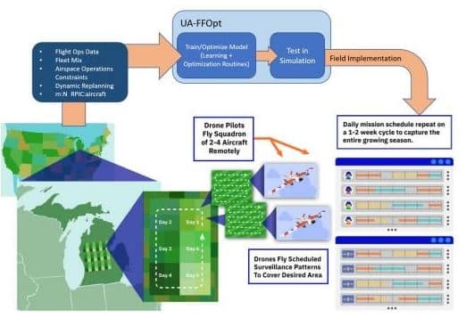 For example, agricultural monitoring operations spanning multiple counties may involve dozens of aircraft and multiple ground crews. FLOE optimizes deployment locations, schedules missions, and minimizes overlapping flight coverage while incorporating real-time environmental data.