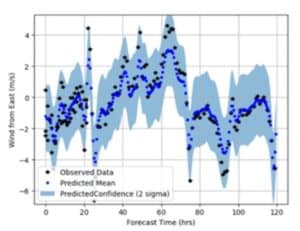 Fig 4. Example of Eastward Wind Confidence Predictions with GDP Modeling (left). Example of GP METAR Confidence Predictions Wind Magnitudes (right).