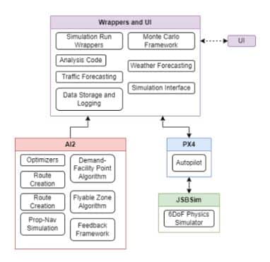 The latest generation of FLOE integrates PX4 autopilot software-in-the-loop (SITL) and JSBSim flight dynamics simulation, enabling high-fidelity modeling of aircraft performance, battery limitations, and obstacle avoidance. The system can seamlessly transition between simulated environments and real-world aircraft operations.